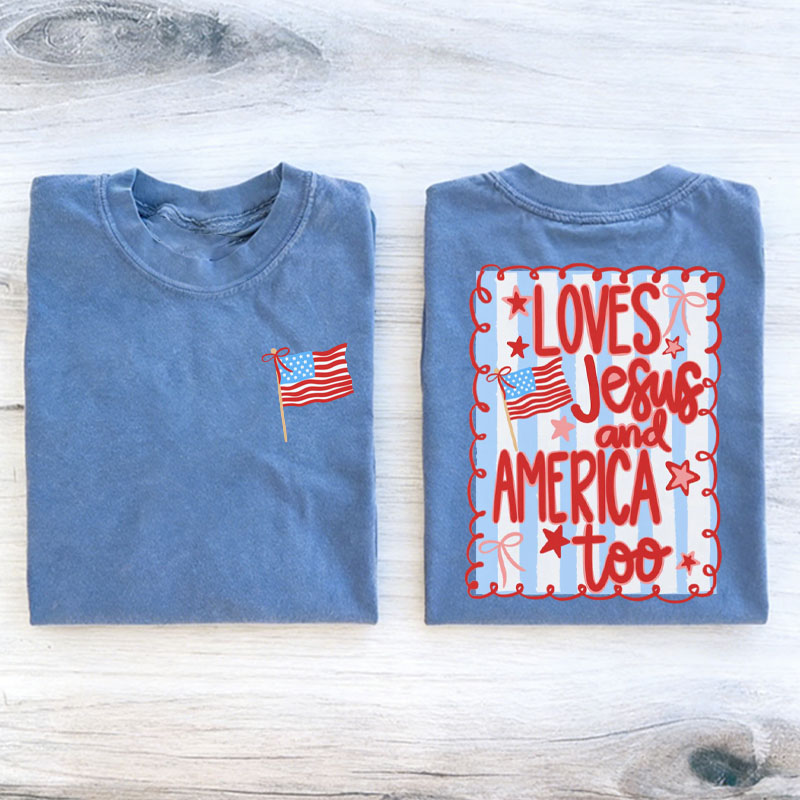 Loves Jesus and America Too 4th of July Patriotic Coquette Bow T-Shirt